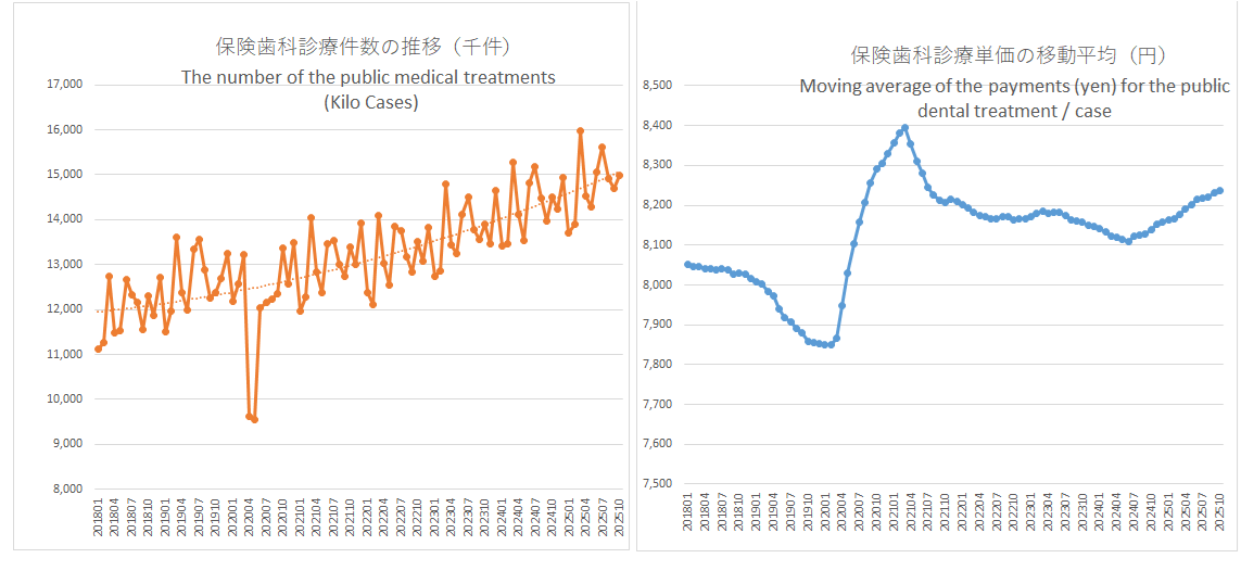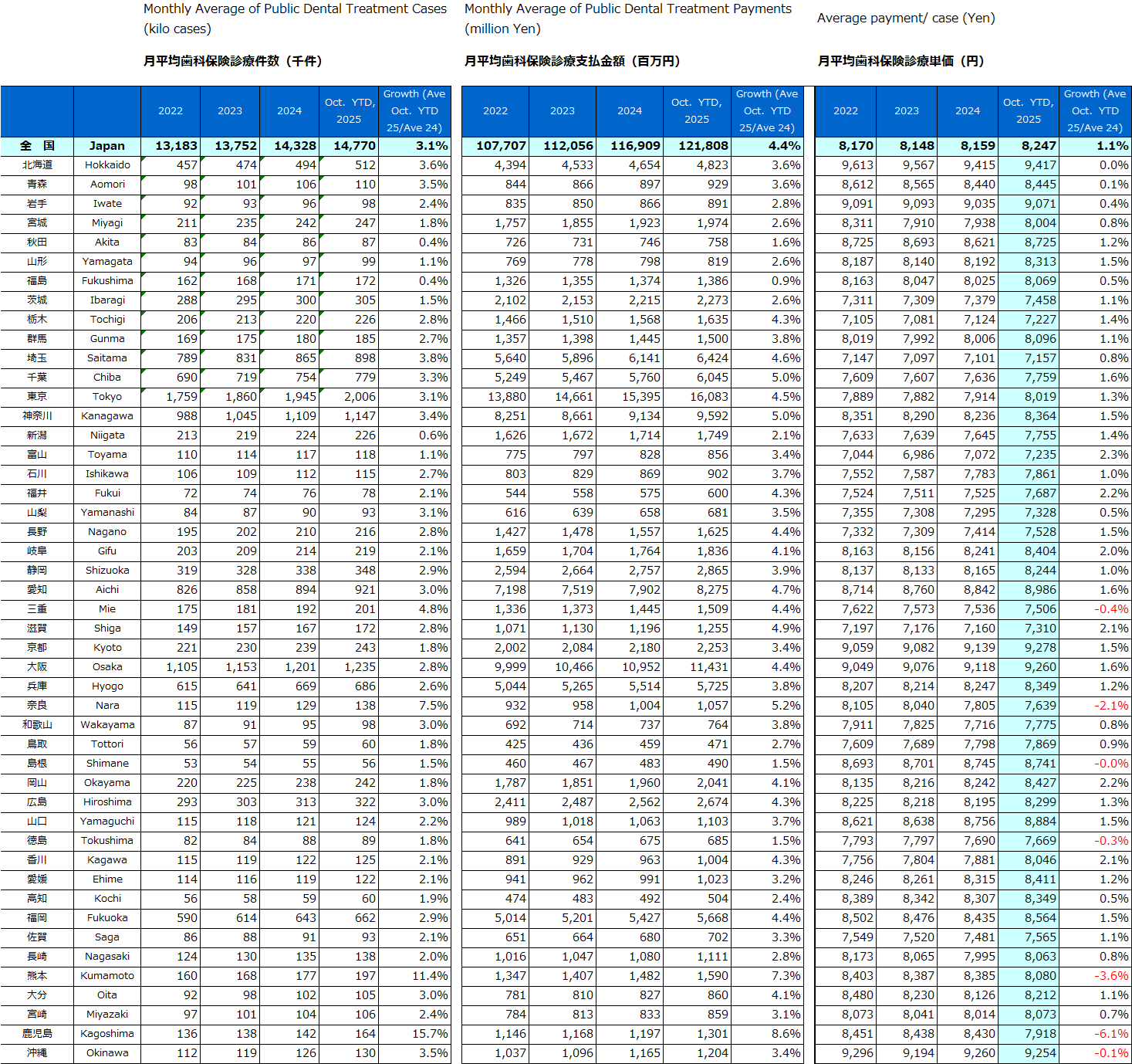 診療報酬:都道府県ごとの歯科保険診療の件数と金額/ 2025年10月まで前年平均と比較して件数+3.1%、診療単価は+1.1% 厚生労働省/法務省/VCP統計データより抽出 Sourced by MHLW/MIAC/VCP Data ヘルスケア関連の市場情報トップに戻る タグ:保険診療, 歯科診療, 診療報酬, 都道府県ごと